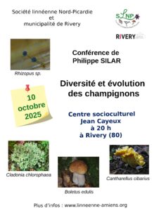 Conférence diversité et évolution des champignons par admin · 22 septembre 2025 DIVERSITE ET EVOLUTION DES CHAMPIGNONS Conférence de Philippe SILAR Société Linnéenne Nord Picardie Pôle socio-culturel Jean Cayeux – salle Ebène Vendredi 10 octobre à 20 h